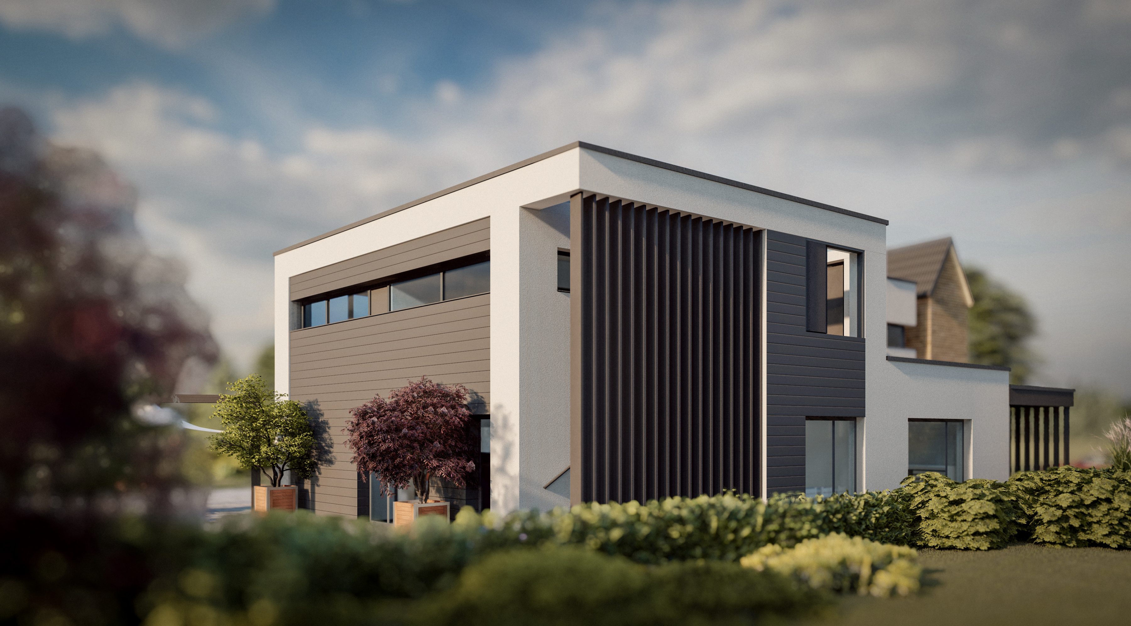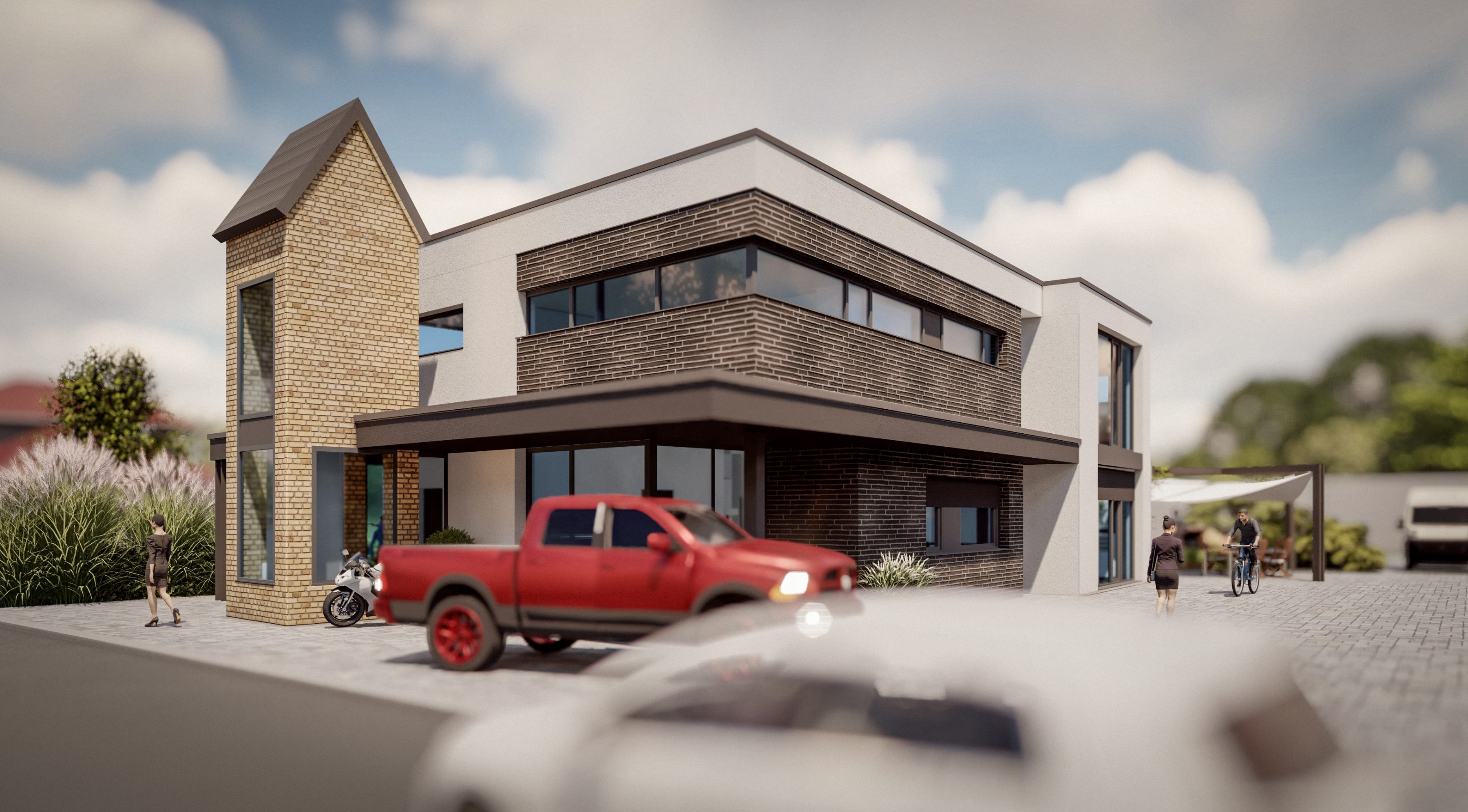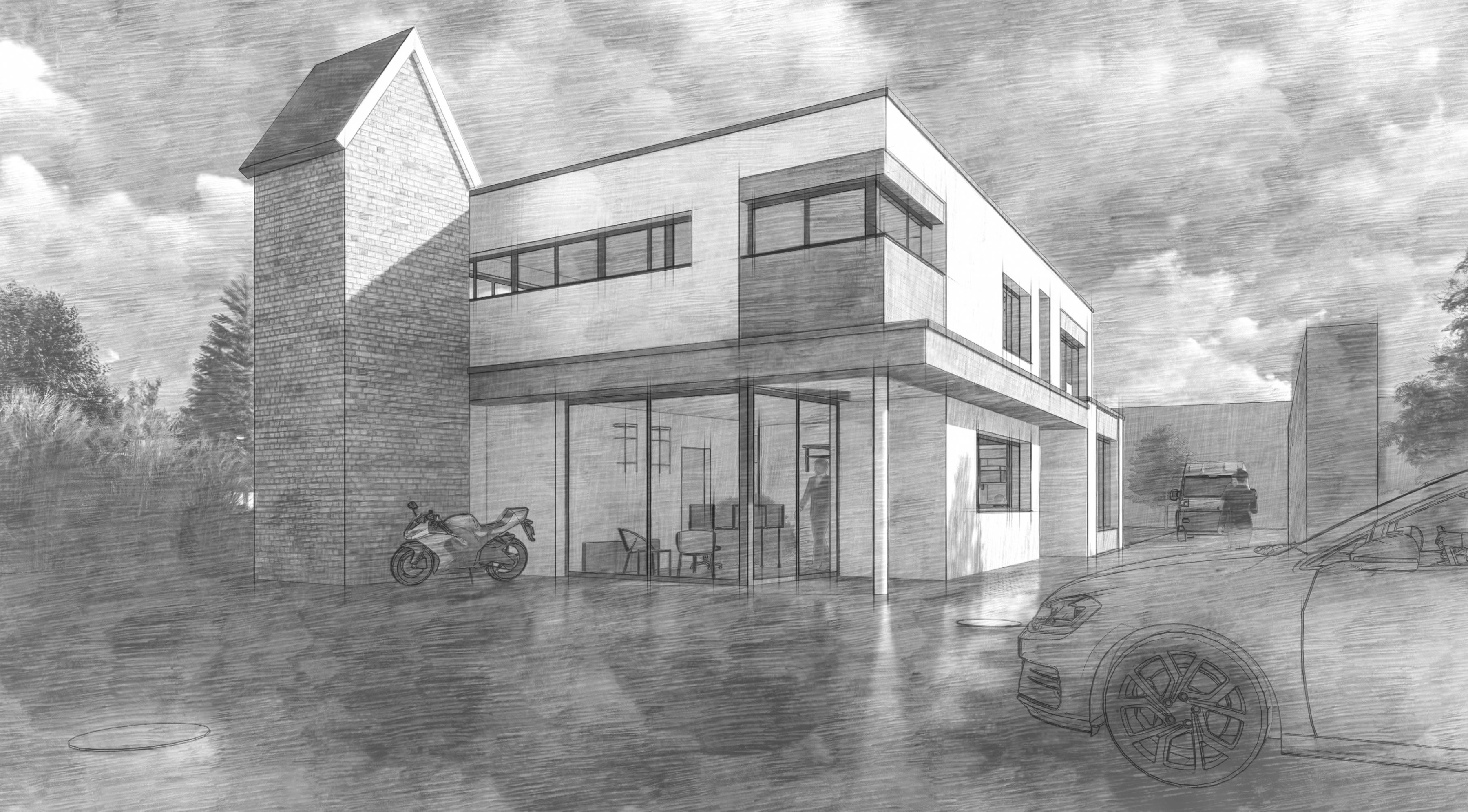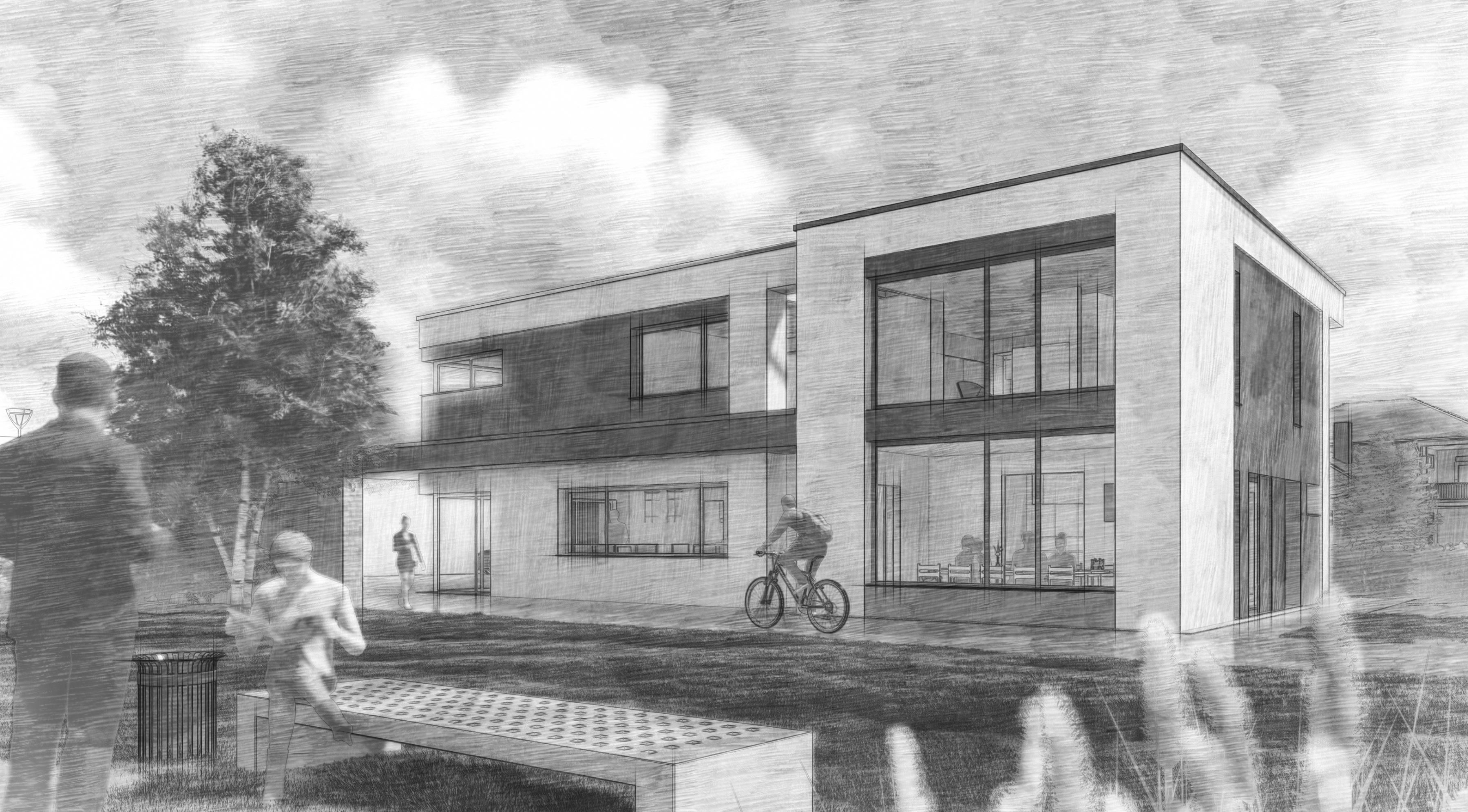 Der Neubau des Wohn- und Geschäftshauses befindet sich in ländlicher und naturnaher Umgebung. Er bietet einen offen gestalteten Geschäftsbereich im Erdgeschoss und modernes Wohnen im ersten Obergeschoss. Geschäfts- und Wohnbereich sind separat begehbar. Eine besondere Atmosphäre bietet die Eingliederung eines Trafohaus aus dem Altbestand.